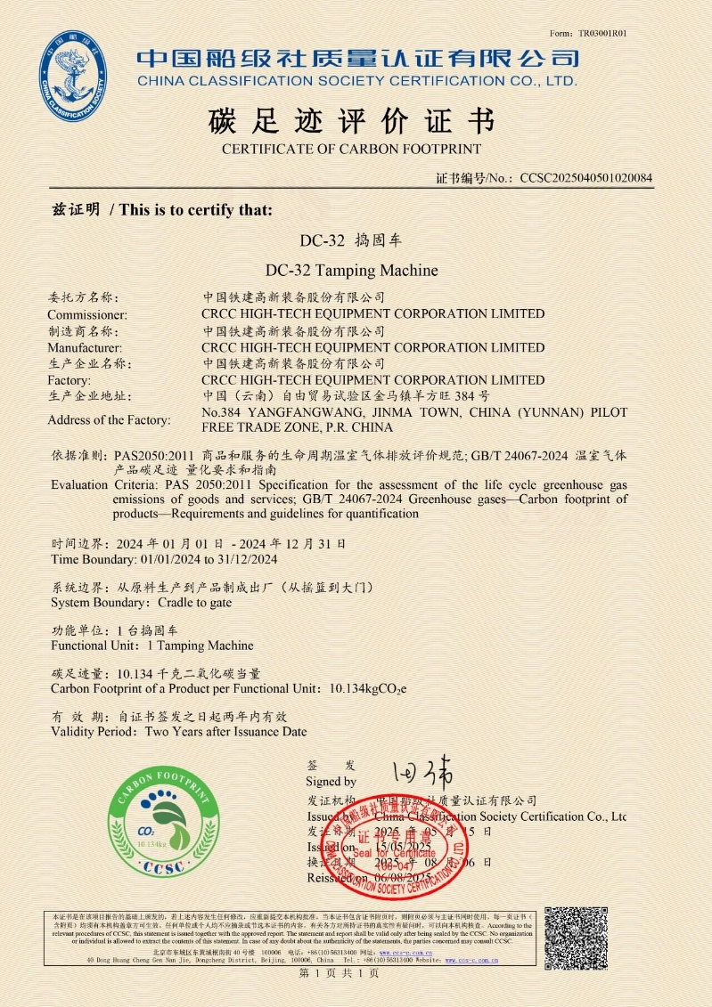 此次發(fā)布的《DC-32搗固車產(chǎn)品碳足跡評(píng)價(jià)報(bào)告》,經(jīng)過(guò)國(guó)際權(quán)威認(rèn)證機(jī)構(gòu)的嚴(yán)格審核,成功斬獲 DC-32搗固車碳足跡證書。這一成果,是我國(guó)鐵路大型養(yǎng)路機(jī)械行業(yè)在綠色發(fā)展的征程上邁出的具有里程碑意義的關(guān)鍵一步。從此,軌道養(yǎng)護(hù)裝備領(lǐng)域擁有了屬于自己的碳足跡管理參照,為后續(xù)的產(chǎn)品研發(fā)、生產(chǎn)以及使用全流程的綠色化升級(jí)提供了堅(jiān)實(shí)的基礎(chǔ)和精準(zhǔn)的指引。